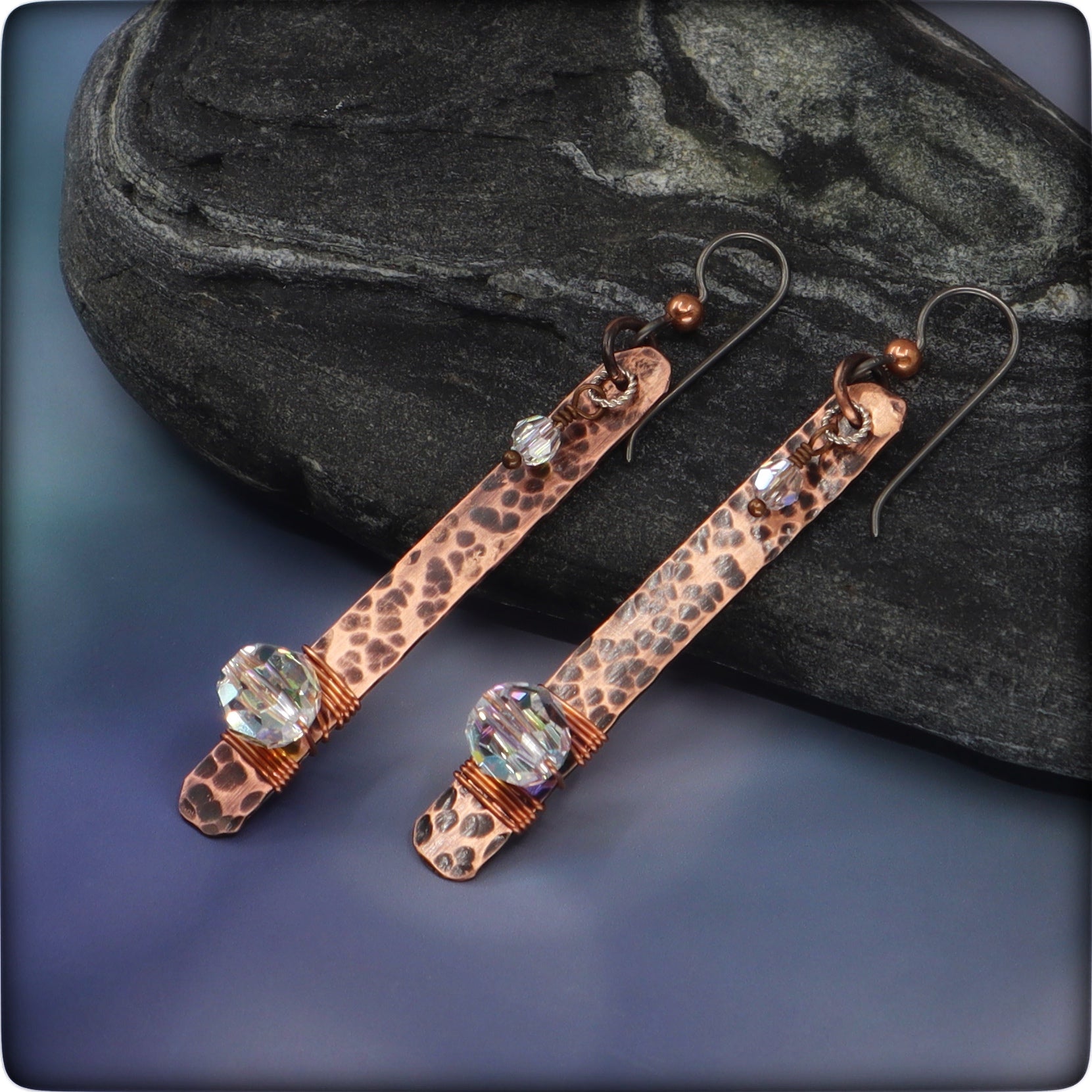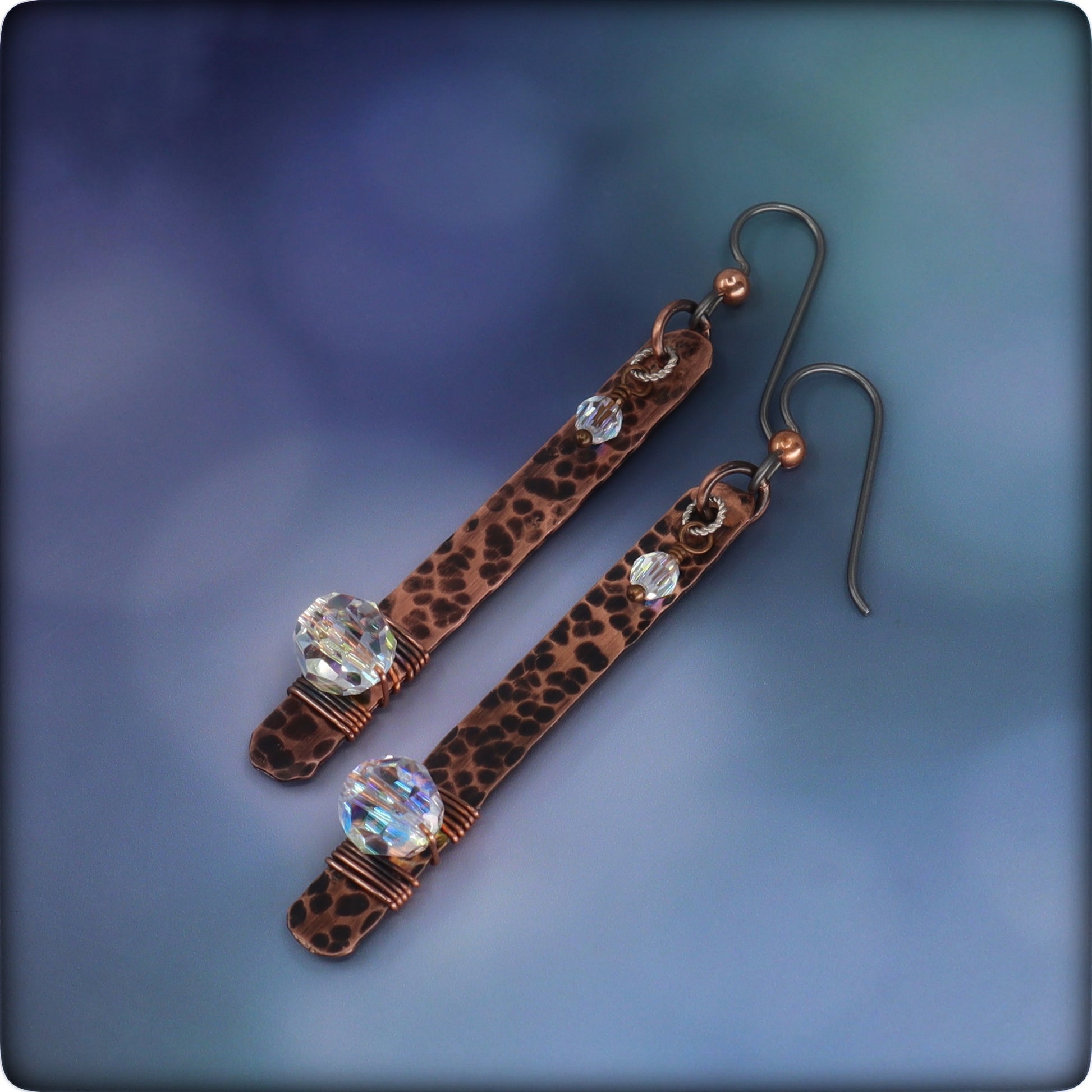 Boho Free Spirit Earrings are all about having fun! I love how the crystals sparkle through my hair! Lovingly created with healing copper and amazing Swarovski Crystals, these earrings are about 2” long and are dangling from niobium hypoallergenic earwires.