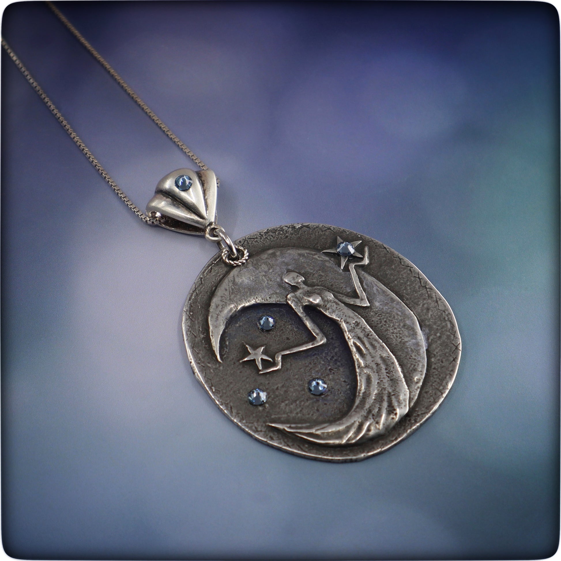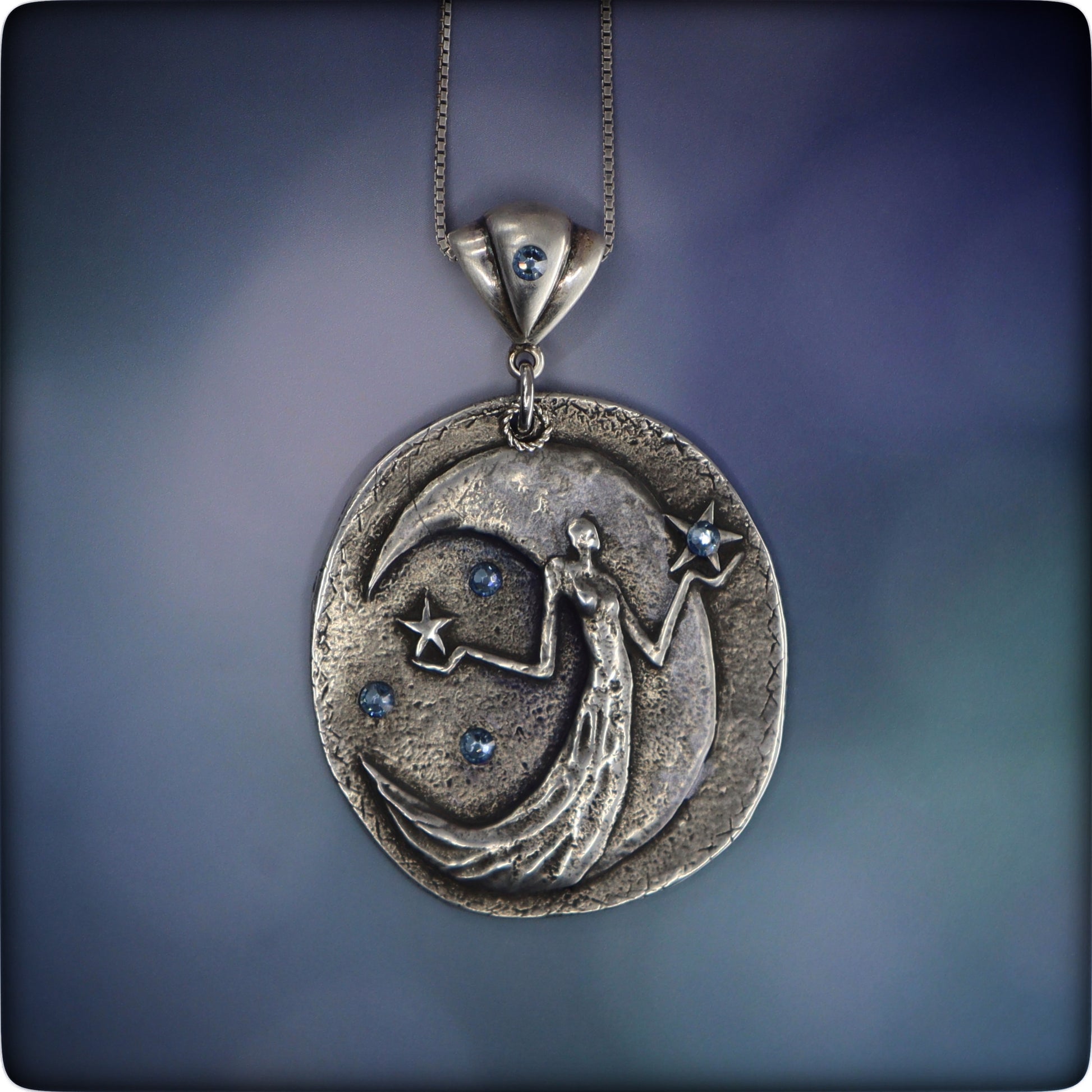 This lovely Goddess is a statement indeed! Measuring in at 2 1/4” tall she is a combination of a sterling silver bail, a handcrafted pewter pendant and a sprinkling of sparkling Swarovski crystals and suspended on an 18” sterling chain.
