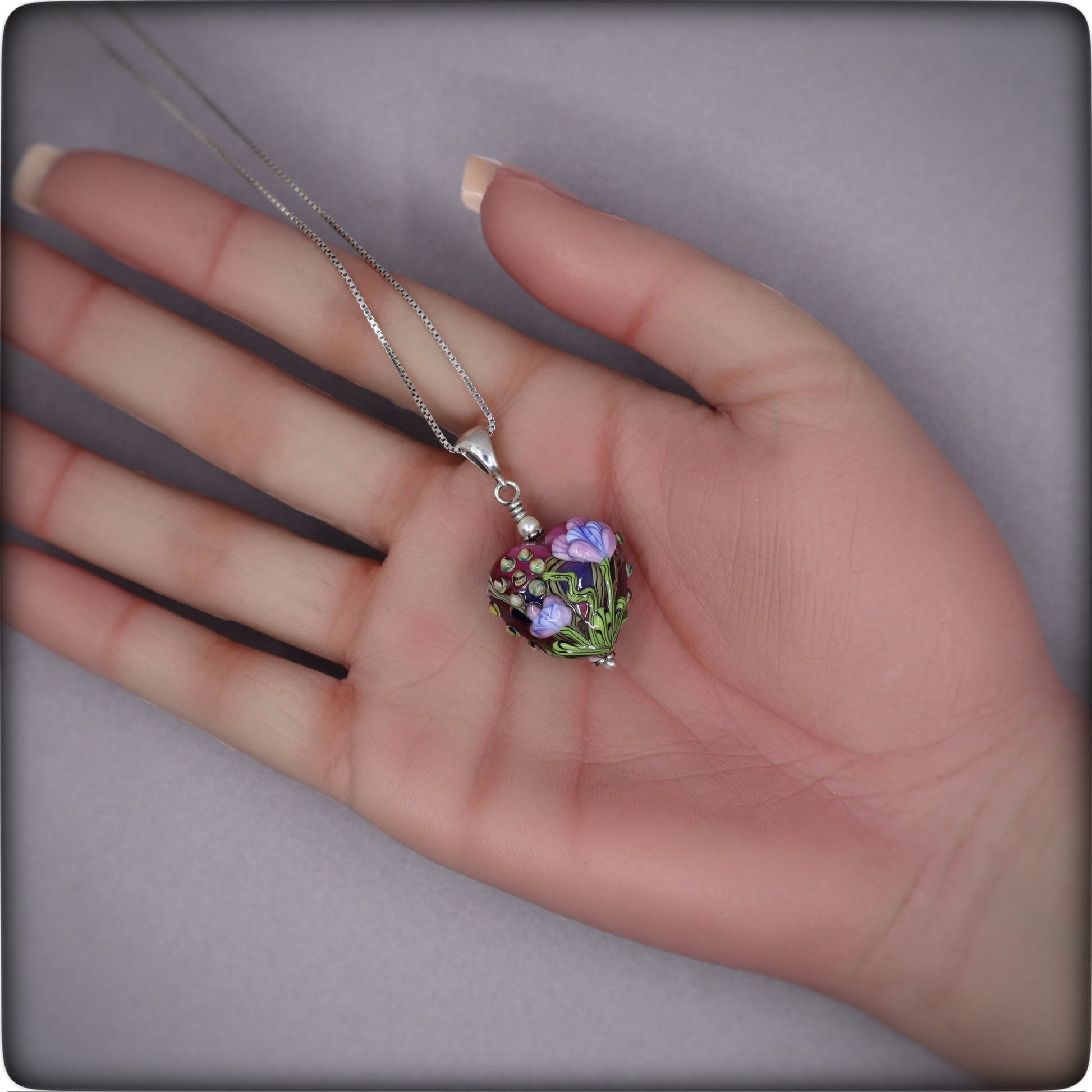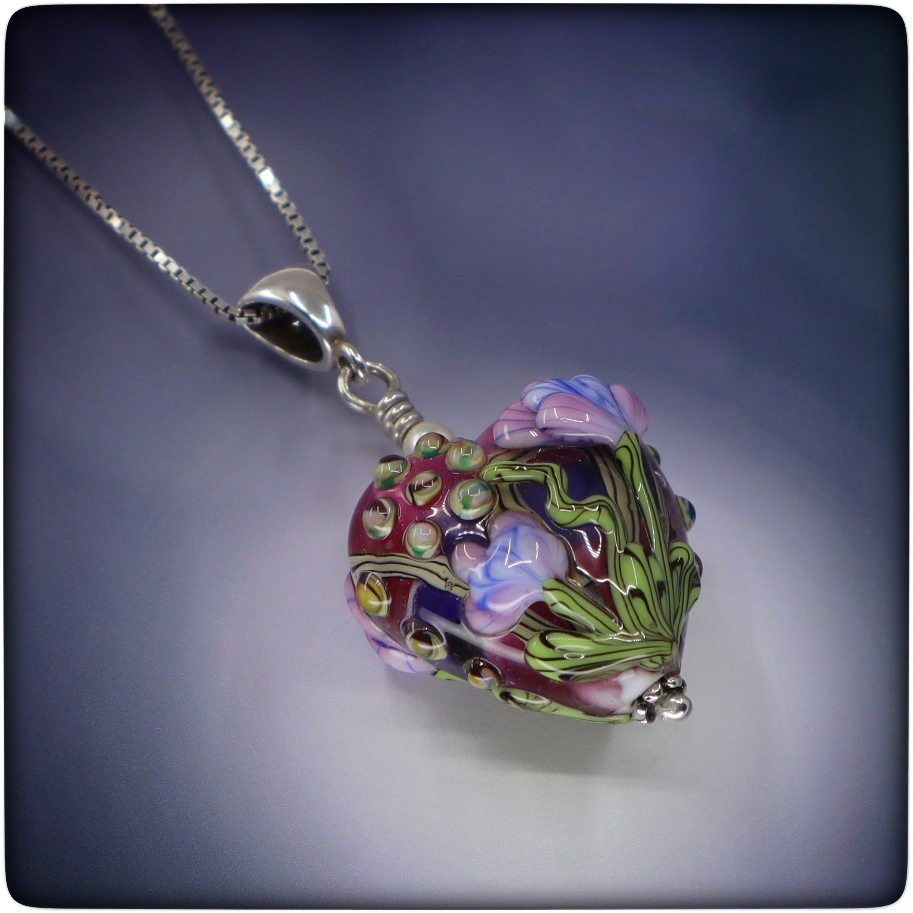 “Heart of Joy” – a luminous lampwork bead handcrafted with swirling glass that captures the warmth of spring in an elegant, heart‑shaped design. Accented with a tiny Swarovski crystal pearl and suspended from a sterling bail and an 18"* chain, this piece is 1 1/2" tall, 3/4" wide and 1/2" deep.