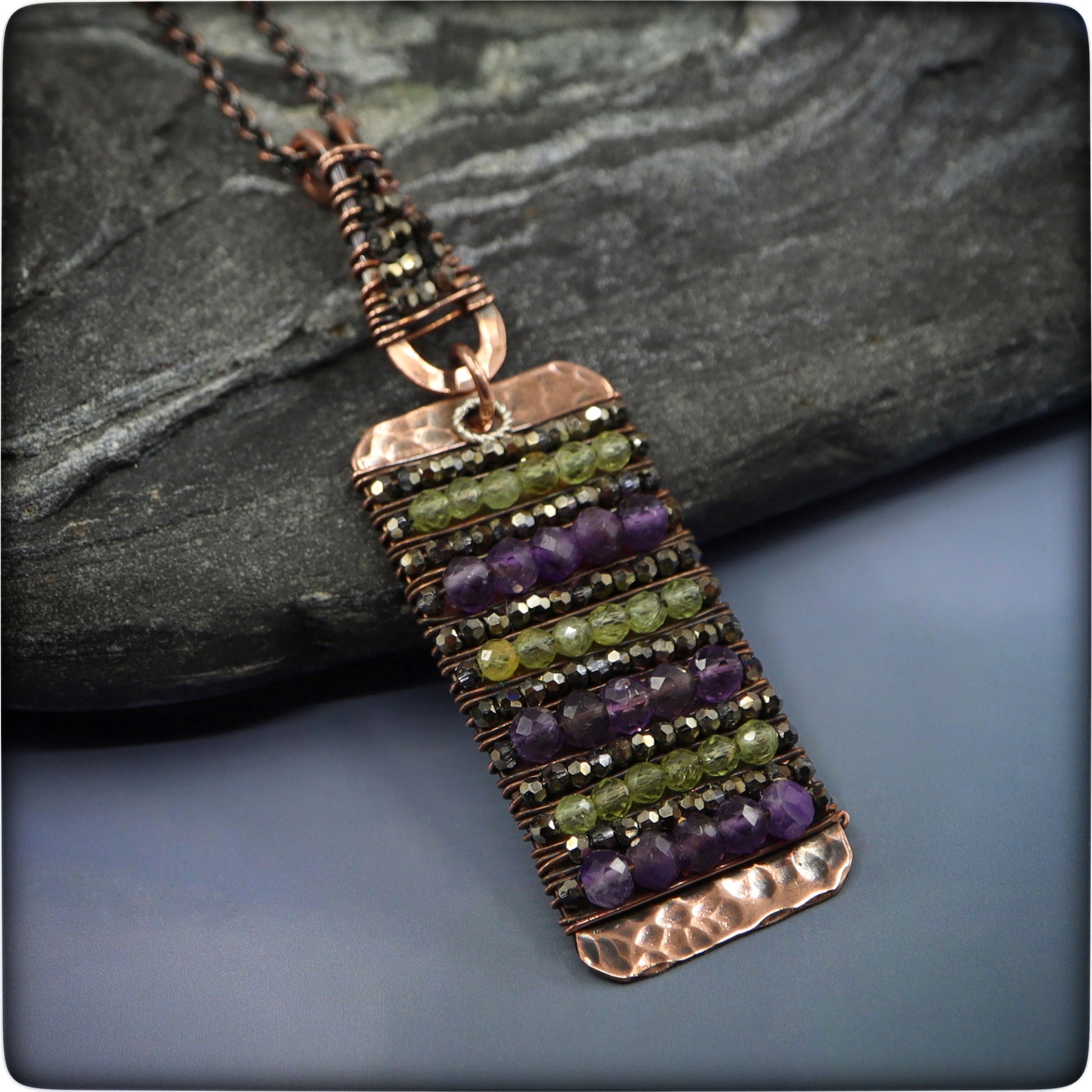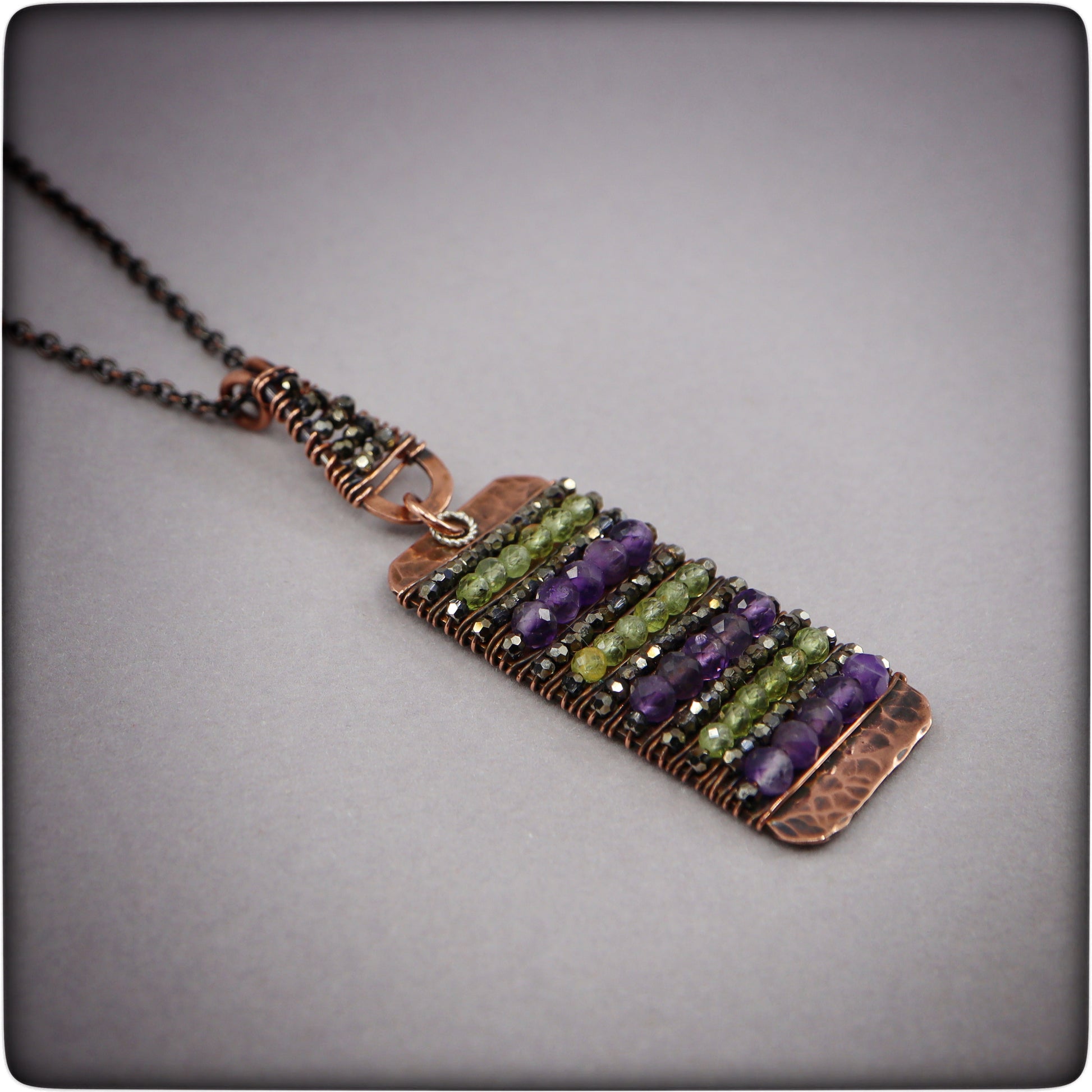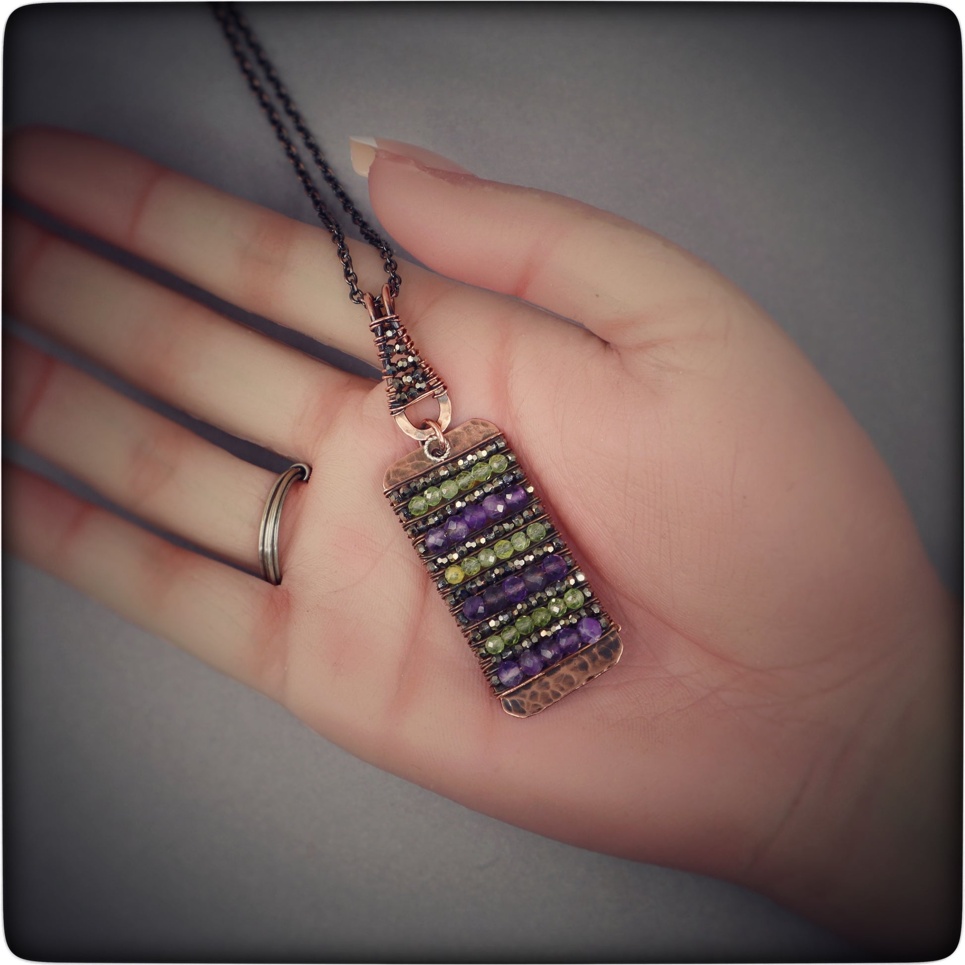 “Verdant Dream”. Embrace the healing properties of Amethyst and Peridot. Handcrafted with love and care, this hammered copper pendant is wrapped with faceted Amethyst, Peridot, and Swarovski Crystal beads. Amethyst is believed to promote calm, intuition, protection from negative energies and help with addiction support. Peridot is believed to promote heart healing, abundance and prosperity, protection and balance and help balance emotional well-being.